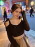 トップス部分がタイトで、スカート部分がフレアなので1枚でバランス◎なコーデに✨ キラキラのチュールと肩のリボンで映えるので、イベントや旅行にも着ていきたいアイテム♡