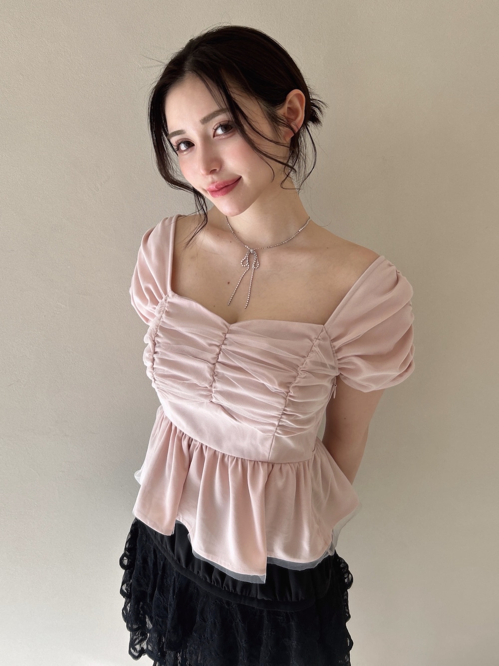フリルスカートを合わせることでトレンドの韓国風に♡ トップスはウエストの高い位置のペプラムデザインでどんなボトムでもスタイルUP✨