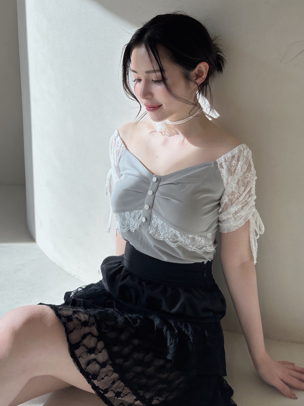 トップスの首元が空いていたのでチョーカーを付けてみました♪ フレアのスカートとチョーカーでトレンドを意識✨