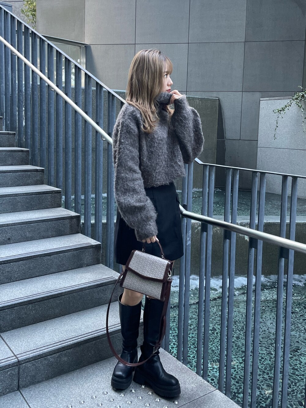 モノトーンでオトナ女子コーデ❤︎ 【tops】伸縮性もあり、ふわっとした着心地抜群ニット!ヒートテックの上から着てもチクチクしないです♡丈感はおへその下あたりで、どんなボトムスにもマッチ!【skirt】中はキュロットになっているので、安心して履けるミニスカート!広がり過ぎずタイトすぎないので、腰周りすっきり見えます♡【boots】軽く柔らかい、オススメNO.1ロングブーツ!リアルバイアイテム♡ふくらはぎ部分も柔らかいので、ストレスなし◎約6センチの厚底で、疲れにくく盛れます!【bag】ロゴ入りのコンパクトサイズバッグ!持つだけで高みえコーデ完成します♪