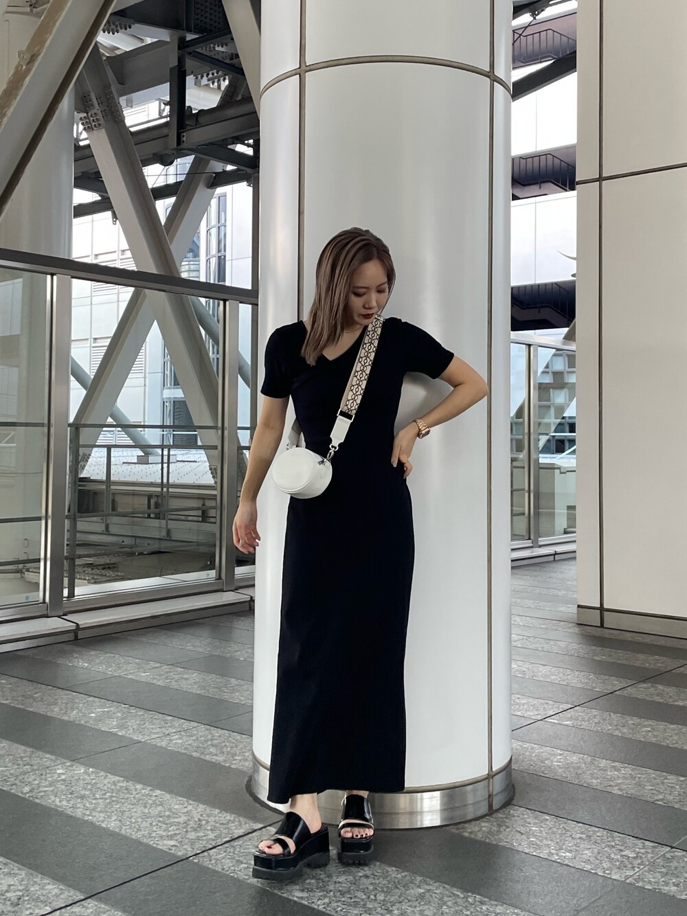 大人ブラックコーデ❤︎ 【onepiece】バックスタイルの肌見せが大人らしいワンピース。二の腕も隠れる半袖タイプ◎伸縮性あり、裾にスリットも入っているため動きやすいです♡158センチ/くるぶし上の丈感 【bag】コンパクトなサイズ感と、ベルトの柄デザインがお洒落❤︎ シンプルなコーデのアクセントに是非。 使ってみた所、ミニ財布と鍵とリップとハンカチ入りました☆ 【shoes】履くだけでスタイルアップが叶う厚底サンダル♥クリアタイプで濡れても心配なし。傾斜も少なく軽いので履き心地抜群。旅行やイベントなどにぴったりです!!(普段23.5cm/足幅普通/23.5cm着用)