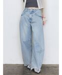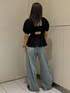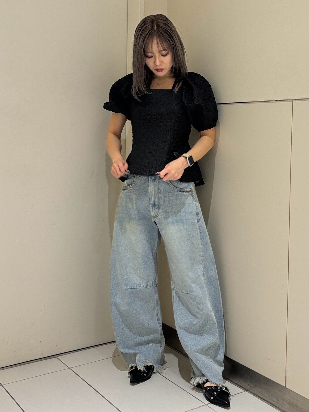 ボリュームブラウスで大人キレイめカジュアルコーデ♡ 【tops】 ハリ感のあるボリューム感とぽこぽこしたデザインがポイント◎後ろの肌見せが女性らしさUP♡ ウエストは絞られているので着るだけで細見え効果! 【denim】 トレンドのコクーンシルエットで、ゆったり履けるお洒落デニム♡ボリュームある分、ウエスト周り細見えします◎158cm/Sサイズ着用 かかとの丈感 【shoes】 今大注目のフラットシューズ❤︎ヒールは1センチ程なので、歩きやすさ抜群!細ベルトで華奢に見せてくれます◎ソックス合わせはもちろんデニムやスカート等合わせ方楽しんでいただけますよ♪