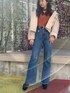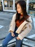 【tops】しっとりとした素材感のレイヤード風topsは肌触りがとても良く、素肌で着用されても着心地がいいです。首元のボタンまで可愛いですよね! デコルテラインが開きが、開きすぎていないので肌見せにチャレンジしやすいですよ!! 【outer】ボアとフェイクスウェードをボンディングした生地を使用しています。ポリウレタンが入っているのでつっぱり感がなく、伸縮性抜群でノーストレスで着て頂けます。バックが、カットオフ仕様なのも綺麗目になりすぎず可愛いです!! 【pants】155センチの私でも、履きやすい丈感のフレアデニム!(S着用)ウエストラインもベルトが無くても細見えしてくれます。