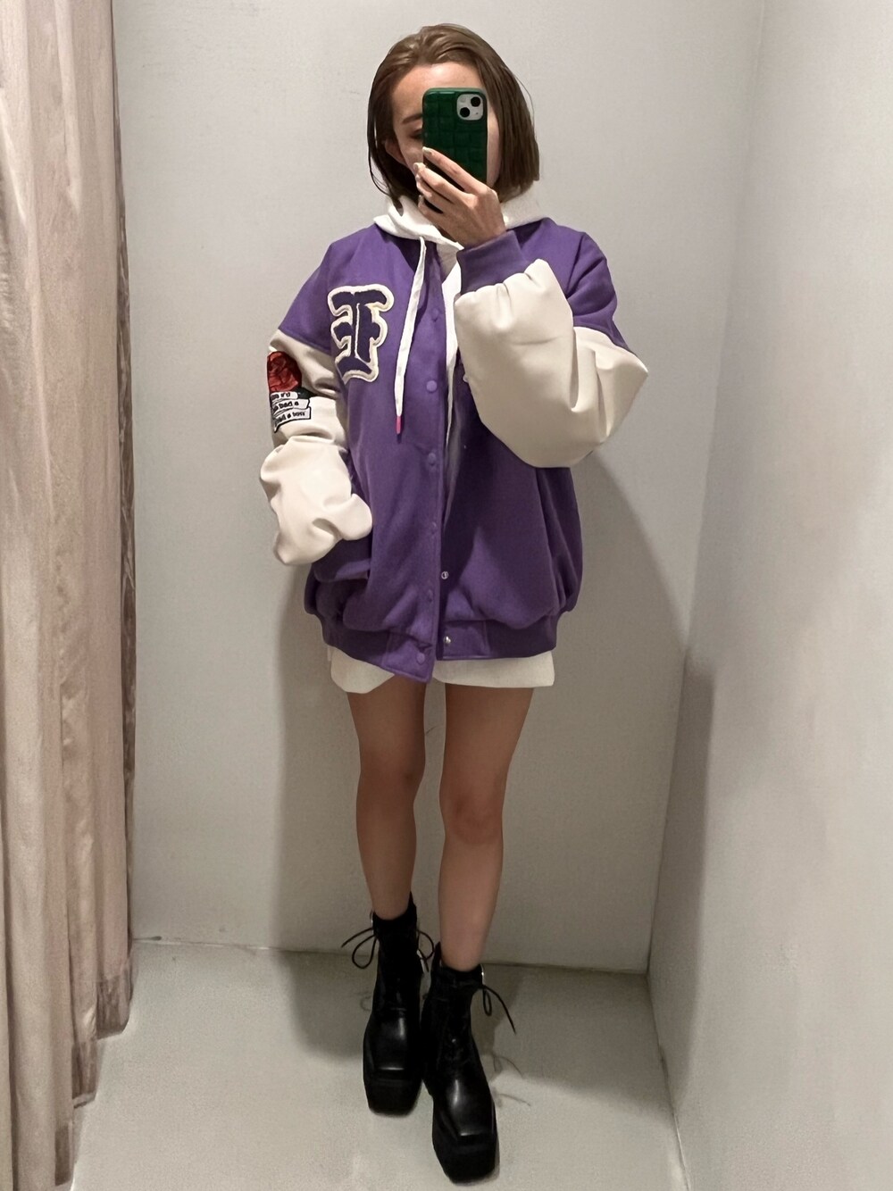 【スタジャンを主体としたコーデ❤︎】 (スタジャン)春まで使って頂ける軽くてたくさん着込んで頂けるアイテムです🥺 156㎝お尻まで隠れるサイズ感が可愛いです🥲 (フーディー)同じ丈のアウターとあわせて見ました‼︎フードが大きくポケット付きです。ホワイトにピンクのポイントが可愛いです🥹 (シューズ)23.5㎝Mサイズ着用 11センチヒールです👠🤍