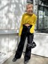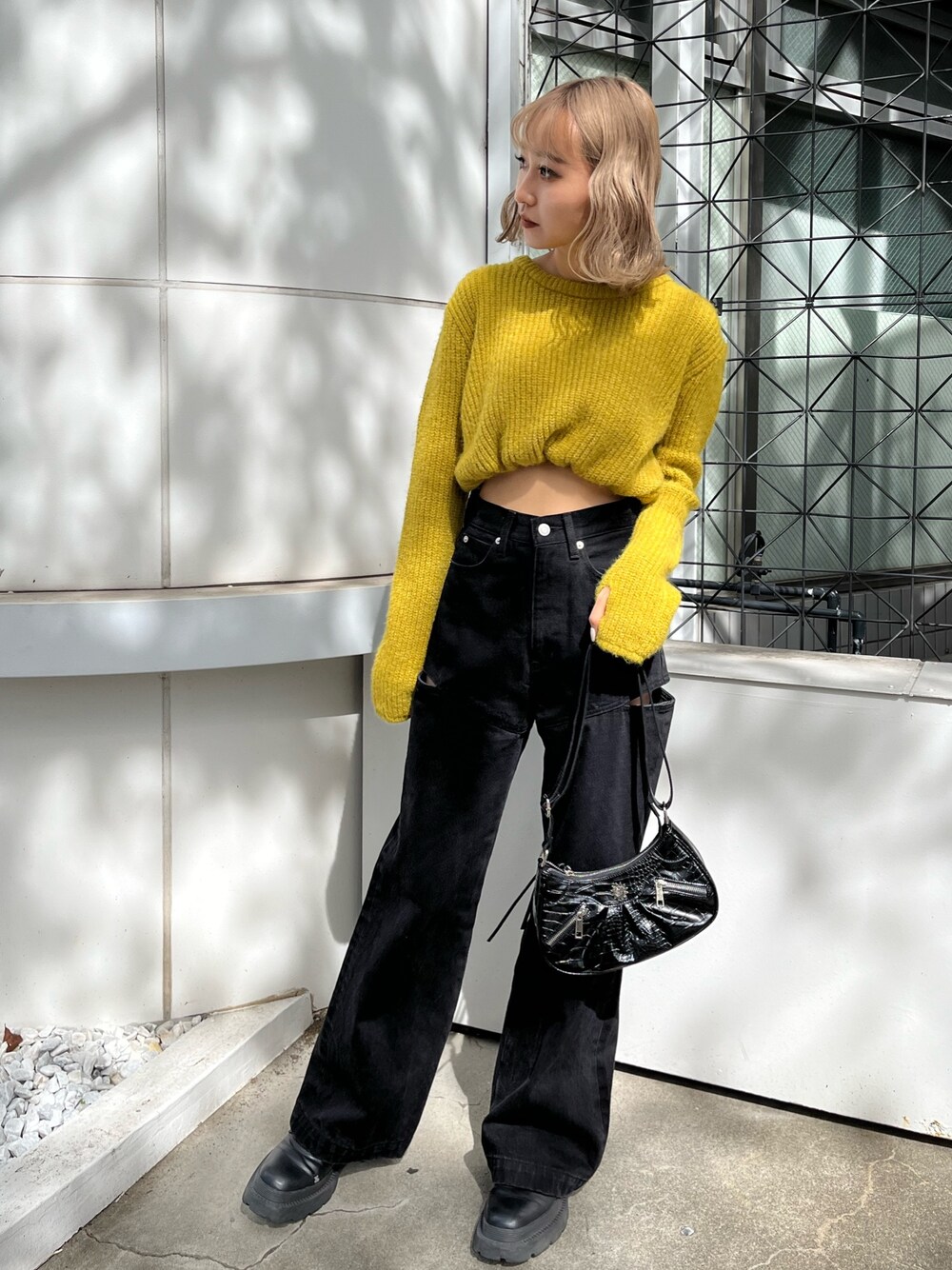 【マスタードカラーコーデ🌟】 (トップス) サイドで絞って着用できます! わざとお腹見せて後ろ少し隠すように着るのおすすめです♡ 指が空いてるのトレンドで可愛い〜! (デニム) 156㎝Sサイズ着用! サイドの上の方が空いてる為細見え効果大♡ (シューズ) 23.5㎝Sサイズ着用 雲の上ブーツ再入荷してます🥾☁️
