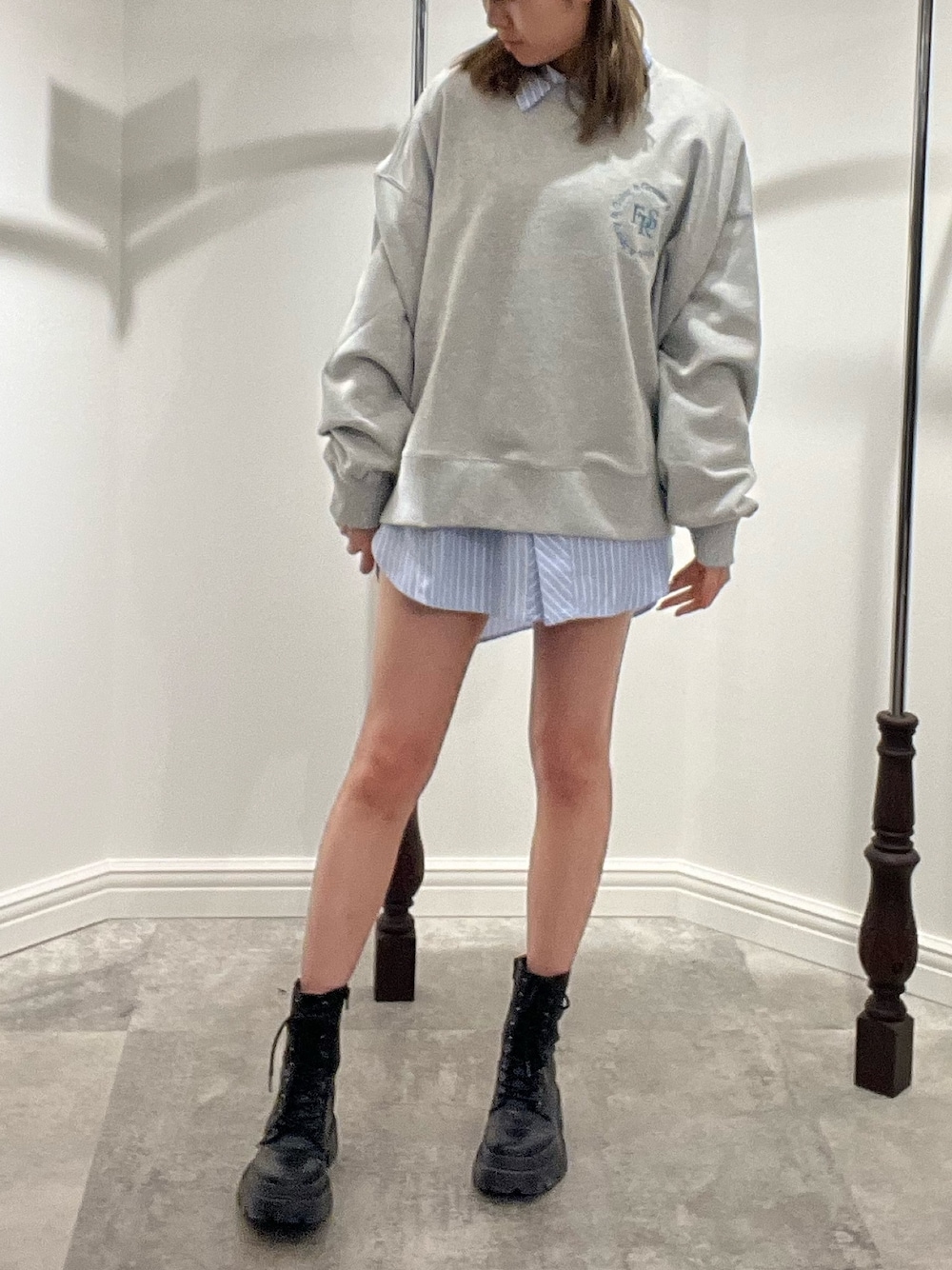 【ワンピース風コーデ👗】 (シャツ) 156㎝でお尻すっぽり隠れるサイズ感です インナーにショートパンツ着用していて ワンピース風にスタイリングしてます‼︎ しっとりとした素材なので、シワになりにくいです! (スウェット) ERSのロゴが付いていてシンプルで 可愛いですよね‼︎♡ 中も、ゆとりがあるので写真のように中に着込みレイヤードして頂きやすくおすすめです‼︎ (シューズ) 23.5cm Sサイズ着用。 スニーカー感覚で履いて頂けるとっても軽いシューズです☺️🩷