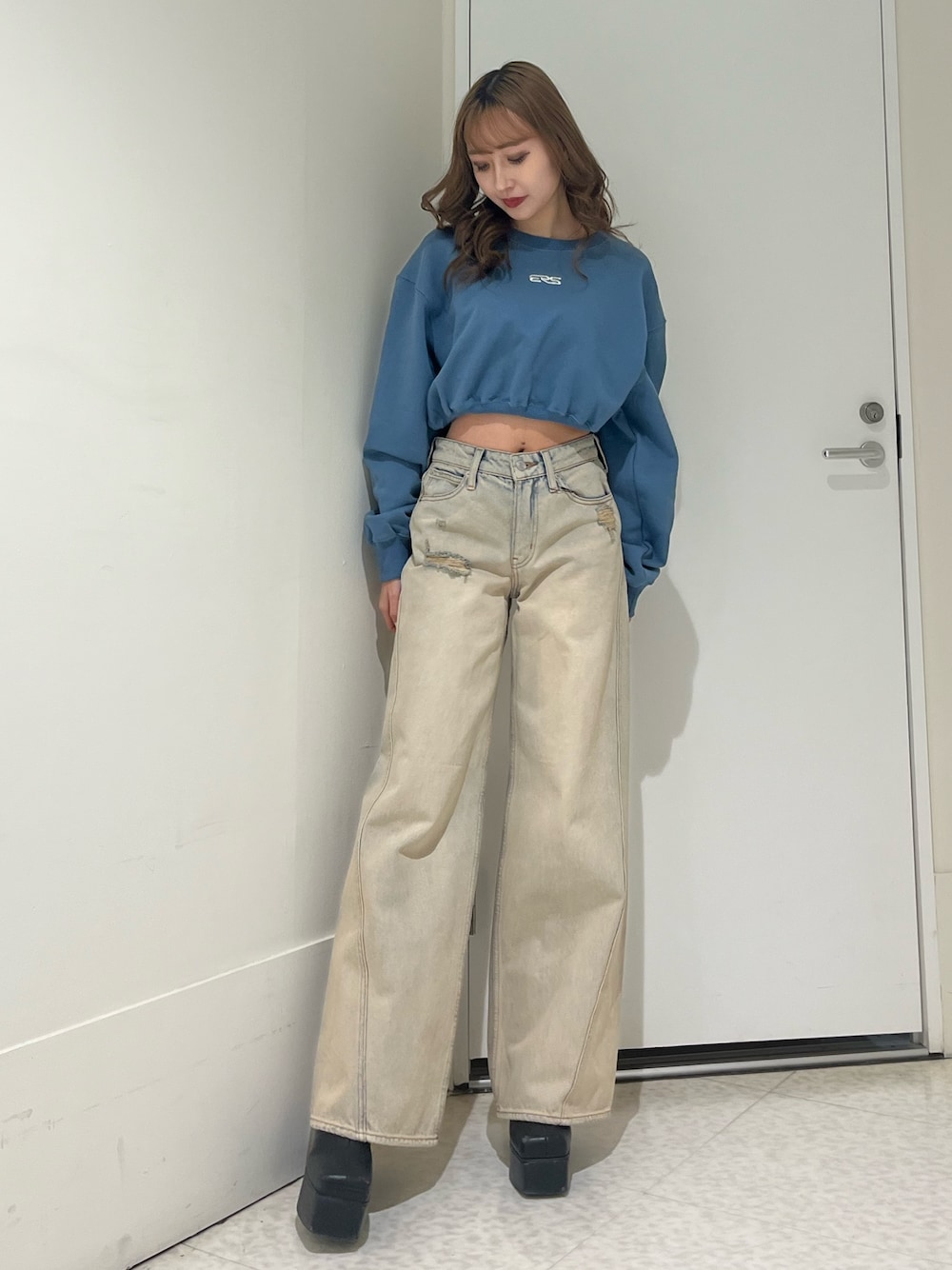 (トップス) おへそ上の丈で、ゴムが入っている為ウエストが細見えできます‼︎ (デニム) 156㎝Sサイズ着用。 股上が短いので腰位置が上がって見えて足長効果抜群です💫 (シューズ) 23.5㎝Mサイズ着用 EVRIS定番のシューズ👞 高低差があまり無いので履きやすいです!