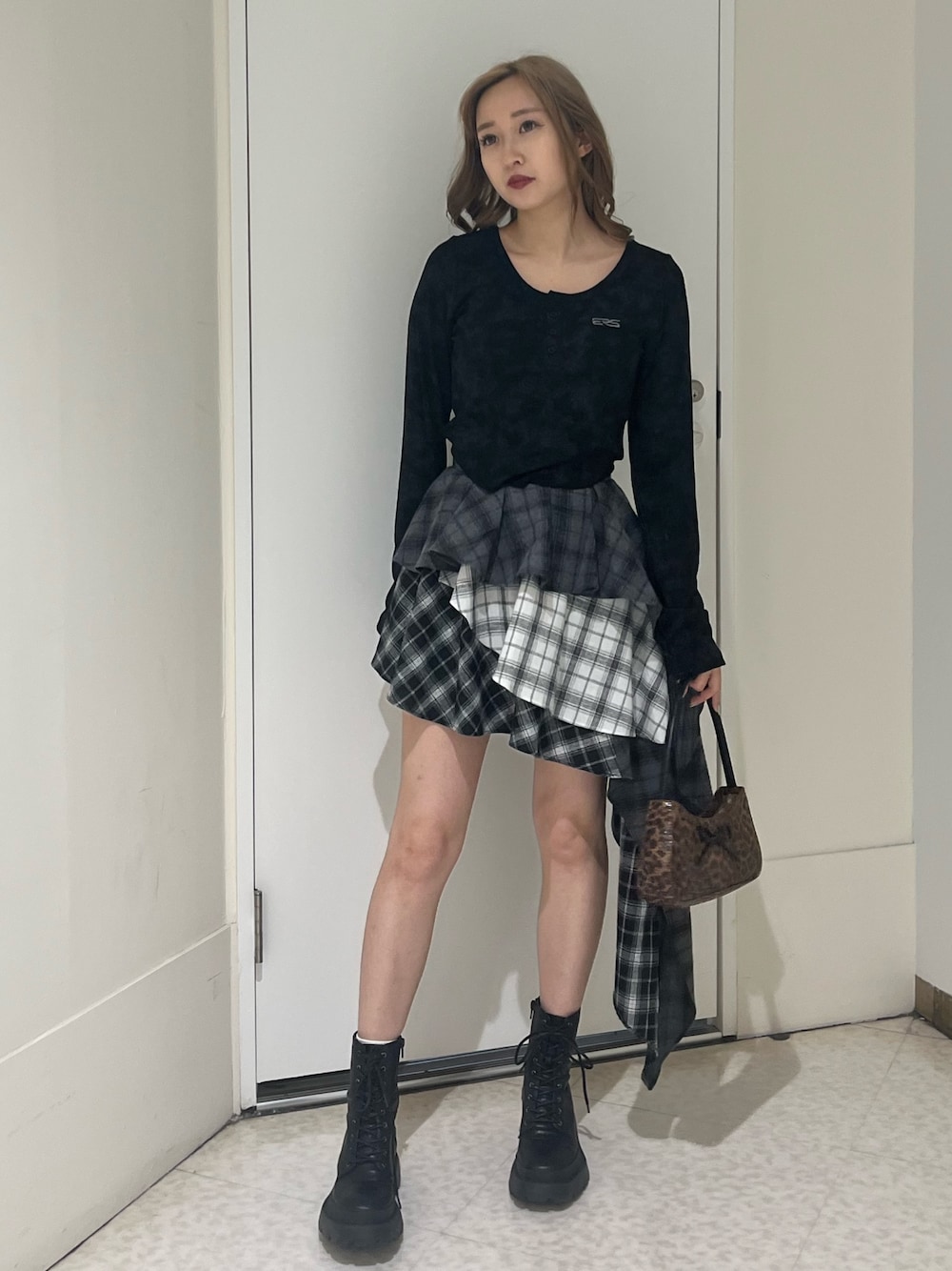 (トップス) ピッタリタイト目です! 生地がとても柔らかくて、丈もハイウエストパンツで合わせれば短すぎないですよ! (スカート) 156㎝Sサイズ着用 ボリュームあるデザインで可愛いです! インナーパンツ付きで安心です😮💨♡ (シューズ) EVRIS定番のヒール! あまり高低差無いので履き心地抜群です (バック) トレンドのリボンを押さえたバック🎀♡ 硬めでしっかりした素材です。