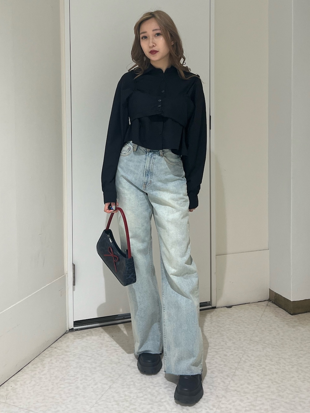 (トップス) シャツとベスト取り外し可能です! ショート丈なので、トップスや羽織りとして着回してもスタイルアップして見えます‼︎ (デニム) 156㎝Sサイズ着用 EVRIS定番の人気デニム! ウエストタイト目ですが、足のライン拾わない為足がまっすぐスッキリして見えます‼︎ (シューズ) EVRIS定番のヒール! あまり高低差無いので履き心地抜群です (バック) トレンドのリボンを押さえたバック🎀♡ 硬めでしっかりした素材です。