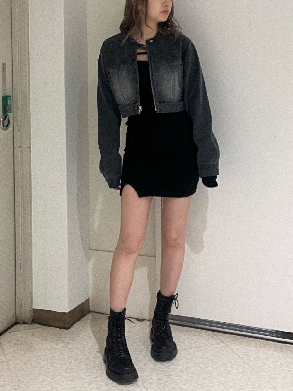 熊澤姫奈(EVRIS)のデニムジャケット「デニムバイカーブルゾン【セットアップ着用可能】」を使ったコーディネート