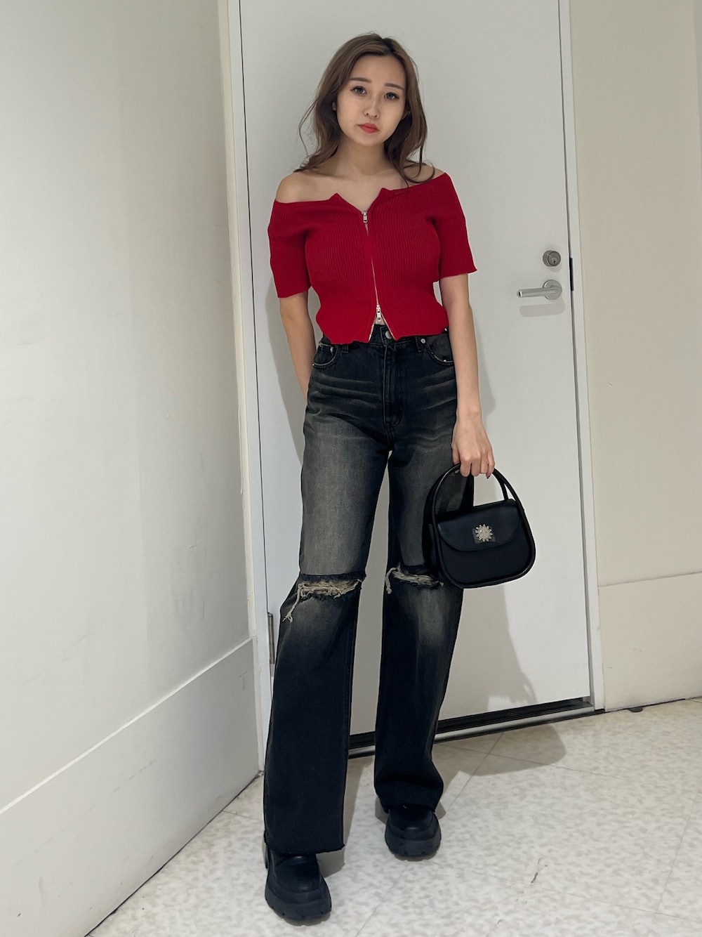 (トップス) ジップで肌見せ調節可能です‼︎ 肩を少しずらしてオフショルで着ると二の腕隠れて細見えできます‼︎ (デニム) 156㎝Sサイズ着用 ダメージが膝上にあるので足長効果✨ (ブーツ) 23.5㎝Sサイズ着用 とても軽くて吐き心地抜群‼︎ (バック) シルエットが可愛い持つだけでポイントになるアイテムです‼︎大人気のサニーモチーフ付き🌞