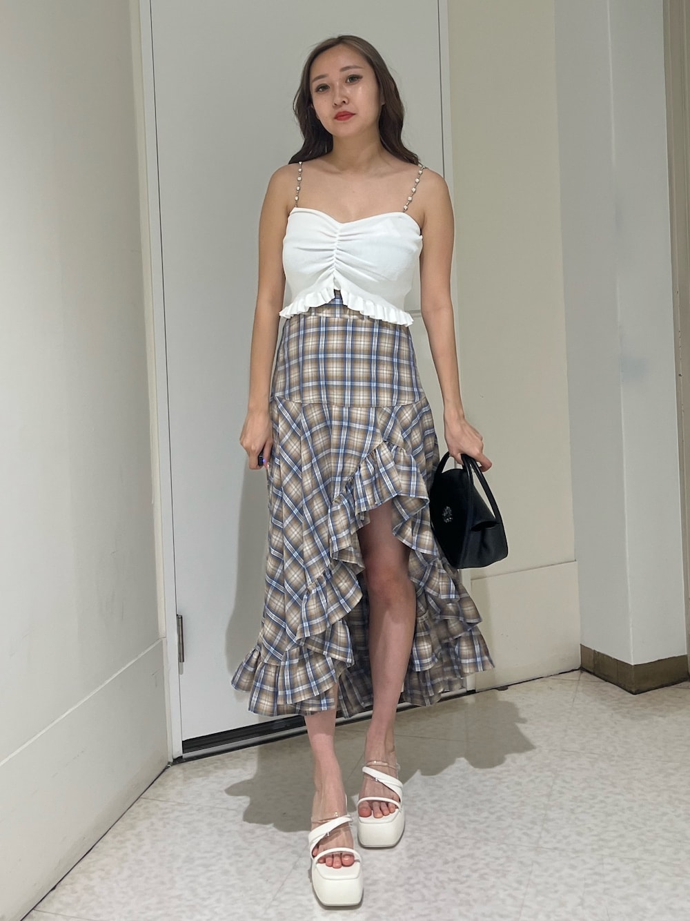 熊澤姫奈(EVRIS)のスカート「ランダムチェックアシンメトリースカート」を使ったコーディネート