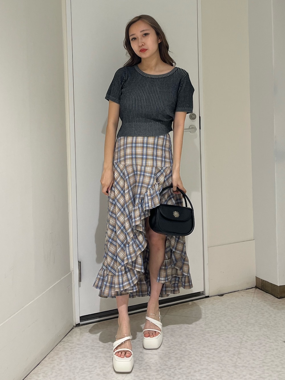 熊澤姫奈(EVRIS)のスカート「ランダムチェックアシンメトリースカート」を使ったコーディネート