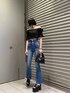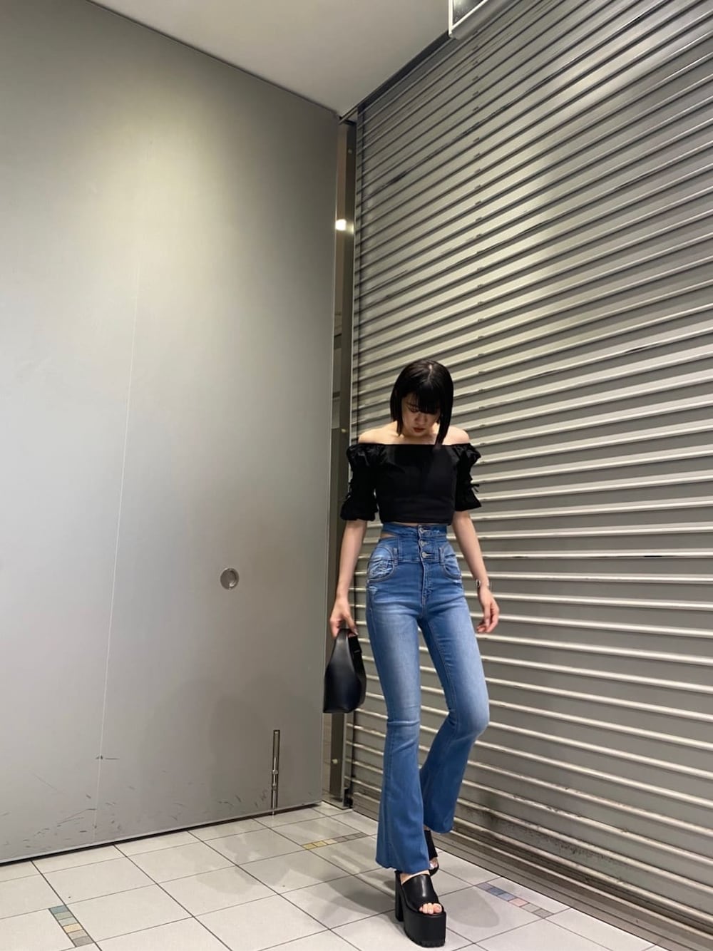 大川まなみ(EMODA)のデニムパンツ「サイドオープンハイウエストフレアパギンス」を使ったコーディネート