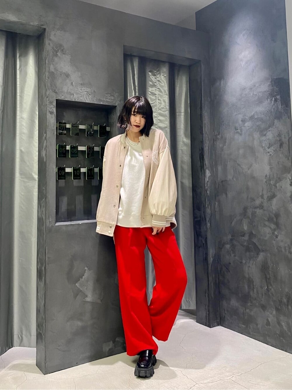 大川まなみ(EMODA)のブルゾン「エンブロイダリーバーシティジャケット」を使ったコーディネート