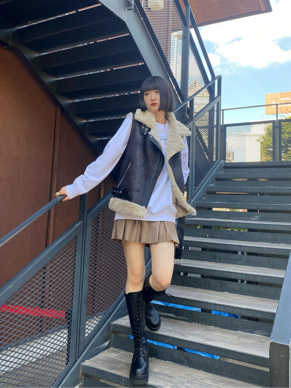 【ベスト】ライダース型のムートンベスト♡秋から冬まで、長く使って頂けます◎レザーの生地感は、柔らかく軽いので長時間着ても着かれないですっ! 丈感は、168cmでお尻半分隠れるくらいの丈感でした♪ボトムは、デニムと合わせても可愛いいです!!