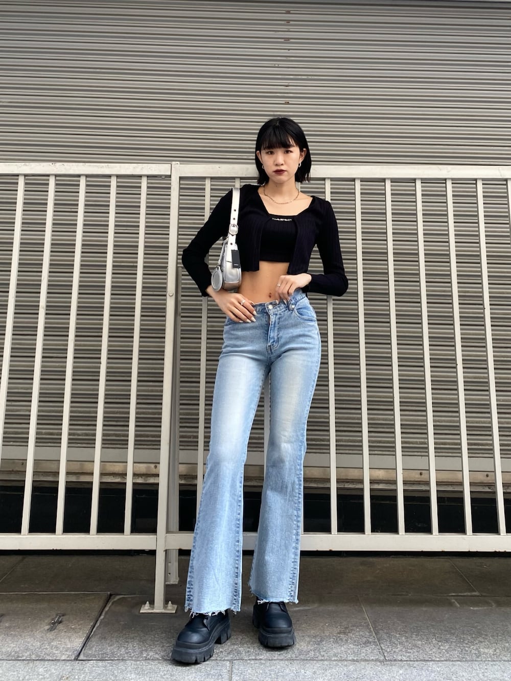 大川まなみ(EMODA)のデニムパンツ「スーパーフィットフレアジーンズ」を使ったコーディネート