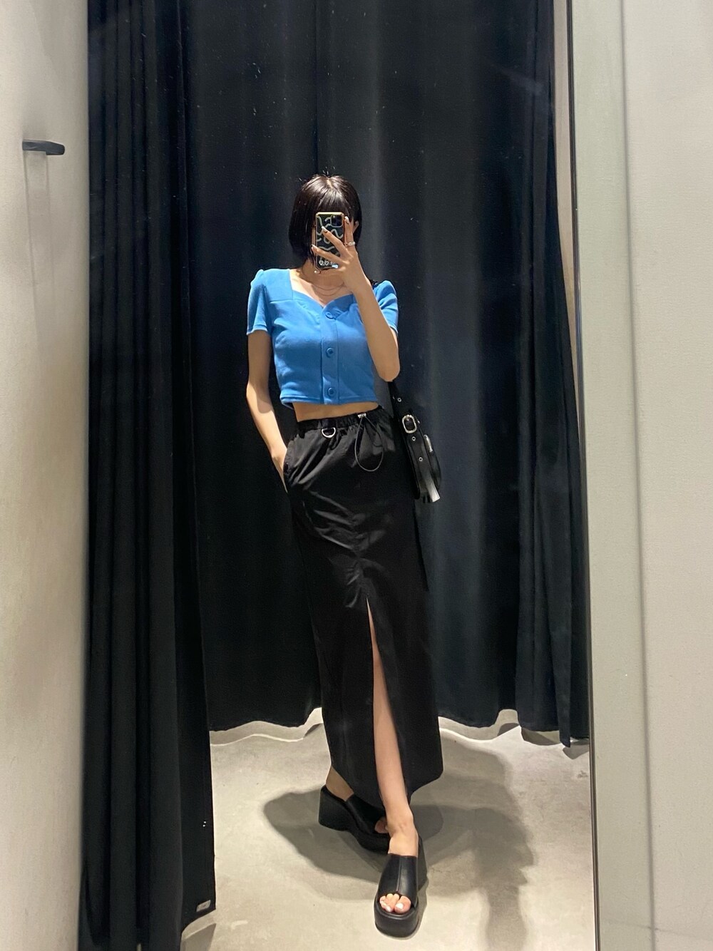 【夏ライブコーデ🩵】 〈トップス〉→身長170cmでおへそ上くらいの丈感です! チクチク感のない生地感です♪ 〈バッグ〉→長さ調節もできるのでショルダーバッグ、肩掛けバッグとしてでも使っていただけます! 長財布も縦にして入れると入る大きさです! 〈スカート〉→ウエストがゴムで、アジャスター付いていて調節できるのでベルトいらずです♪身長170cmで太もも半分くらいから、スリットが入ってます! 〈サンダル〉→ 私は甲高の幅狭で、普段25.0〜25.5cmの靴を履いていて、着用時はLサイズ履いてます。クッション性があるので、歩きやすいです♪