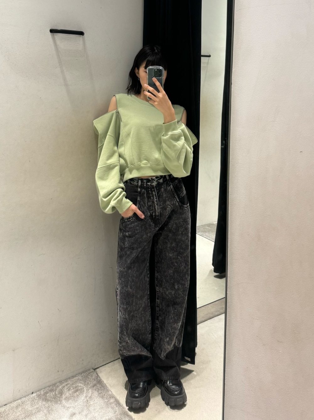 【カジュアルピクニックコーデ💚】 〈トップス〉⇨身長170cmでおへそ下くらいの丈感です! 肩にジップが付いているので、インナーを見せる着方をしても可愛いです💕 〈デニム〉⇨身長170cmでこの丈感です! 裾がツーカラーになっているので、1番伸ばして着て“ずるっと”着ても可愛いですし、裾を“ロールアップ”して着ても可愛いです!