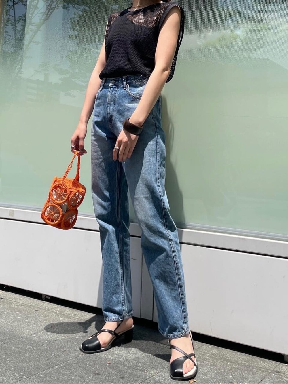 (タンクトップ)メッシュ素材で涼しげなトップス。デニムでカジュアルに合わせるのがおすすめです♡ (デニム)ハイウエストで裾にかけて程よく細身のシルエット。腰回りもぴたっとしすぎず履き心地抜群です。
