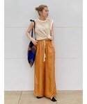 ウエストが総ゴムでラフに履けておしゃれ見えするパンツ!しわにもなりにくいので旅行にも持っていけますね♡大人気のカットソーと合わせてカジュアルなスタイリングがおすすめです!Tシャツは前からみても後ろからみても配色ロゴがポイントで可愛い1枚♡ スカート、ワンピースと合わせてきれいめや、デニムあわせでカジュアルまでコーディネートを楽しめます!