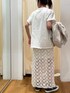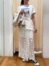 レースの透け感がヘルシーなスカート🫶🏽 フロントのスリットとラップ風のデザインが可愛いです✨ フォトTeeもこの時期にジャケットのインナーに大活躍です!着丈長めなのでアウトして着るのもおすすめです🌼