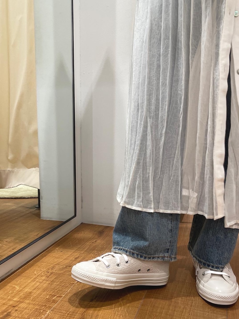 (ワンピース)ワッシャー加工でプリーツ感が可愛いワンピース👗 ポリエステル100%なのでシワの心配もありません♡旅行にもぴったりです! 羽織としても着ていただけるので着回し抜群です♡ (コンバース) Ungrid×コンバース👟 スウェード素材で生地が柔らかいので履き心地がいいです♡
