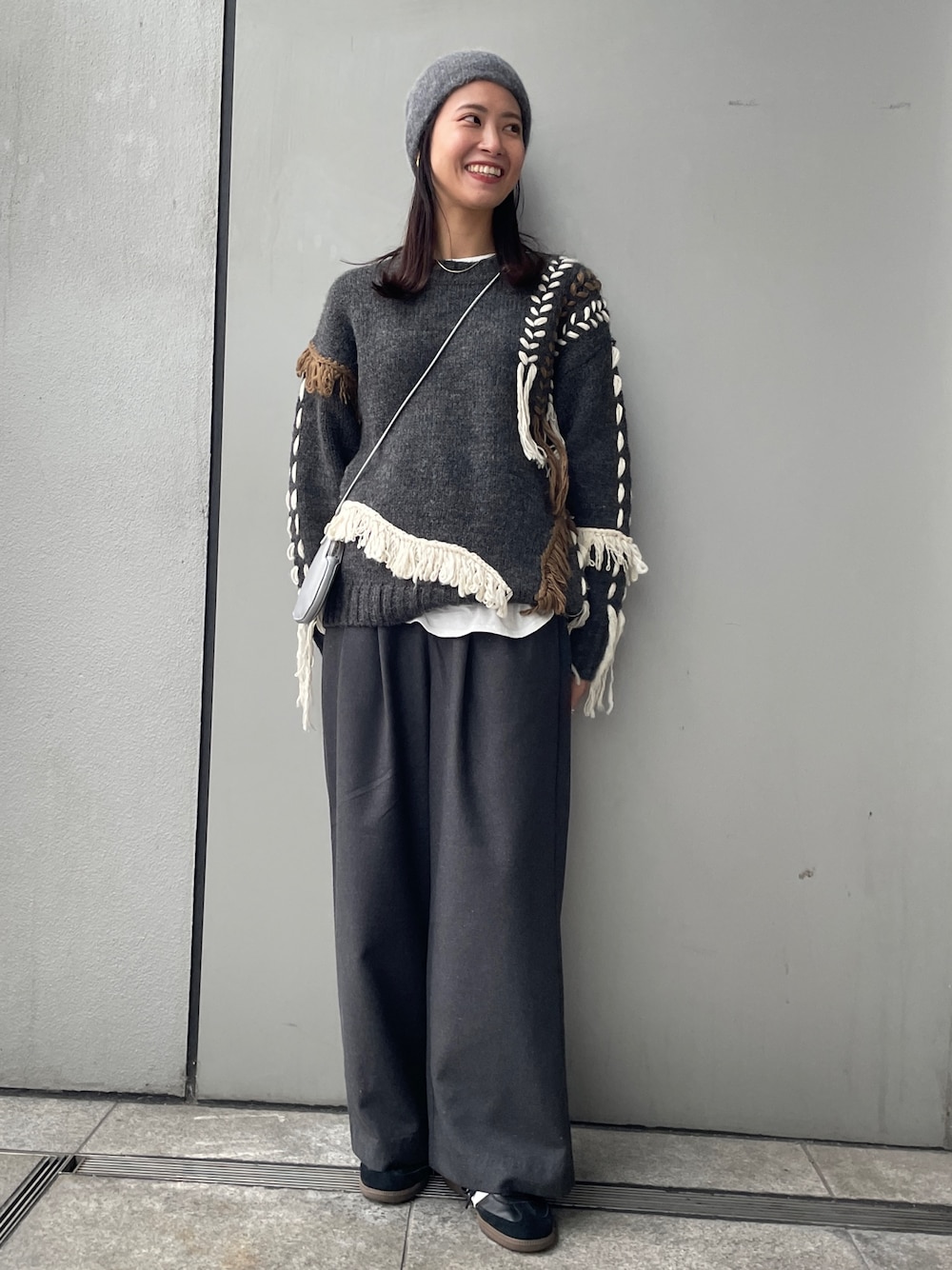 (ニット) レースアップとフリンジのデザインが360度可愛いニット🧶厚手のニットで防寒性もしっかりあります!着丈腰回り隠れますが長すぎないのでボリュームのあるボトムスともバランスよく着て頂けます✨ (パンツ) 裾にかけてストレートシルエットなので腰張りも気にならず脚を綺麗に見せてくれるパンツ! ウエストの別地を縫い合わせたデザインもシンプルなトップスインするだけでこなれ感がでます♡164cmスニーカー合わせで着丈ずるっと穿いて頂けます! (カットソー) スウェットやニットにレイヤードするだけでこなれ感がでるので一枚持っておくと大活躍します!今年は着丈を少し短くブラッシュアップしてます♡ (ニット帽) ふわっとした素材感がコーデのポイントになるニット帽♡柔らかいので後ろから見た時にクシュッとなるシルエットも可愛いです! (バッグ) 紐は取り外し可能なので手持ちのカバンに付け替えてストラップ感覚でも使っていただけます✨