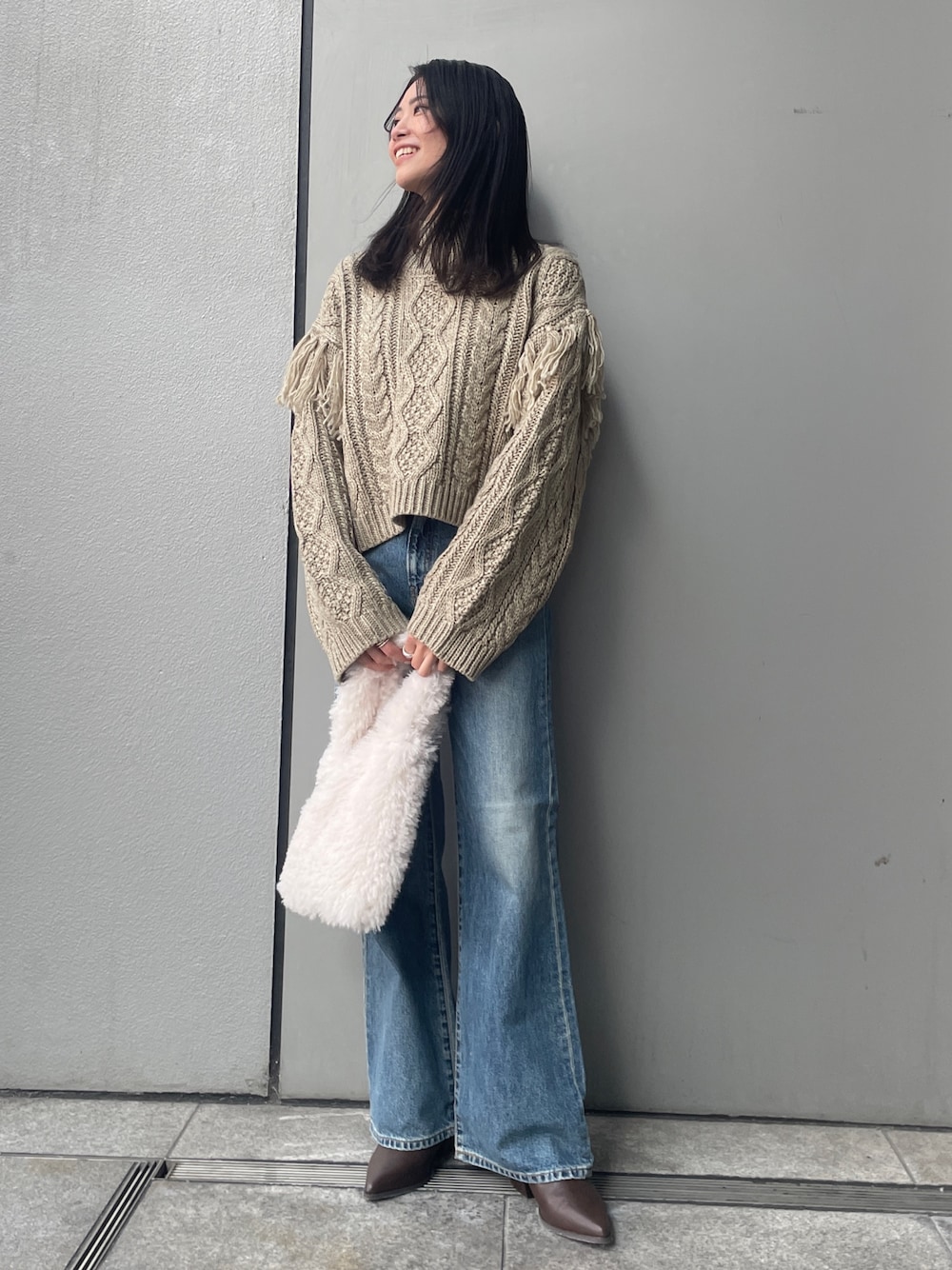 (ニット) バッグリボンのデザインとお袖のフリンジが360度可愛いニット🧶 デニムと合わせるだけでこなれ感がでます♡ インナーはキャミと合わせてヘルシーに着ていただいても可愛いです! (デニム) 裾にかけてなだらかに広がるフレアシルエット👖164cm、25inchフラットシューズ合わせでかかとがしっかり隠れる丈感で着用できました!デニムの太ももあたりの色の落ち感が細見え効果抜群! (バッグ) ファーデザインが秋冬らしいバッグ♡ マチはないですが500mlのペットボトルが入ります!普段荷物多い方にもおすすめです! 持ち手が長いので肩掛け手持ちどちらでも使えます✨ (ブーツ) 普段25cmを履きますがLサイズ着用でつま先は余裕がないサイズ感でした。 ローヒールなので長時間歩いても疲れません✨ポインテッドトゥのデザインがコーデのポイントになりますね♡