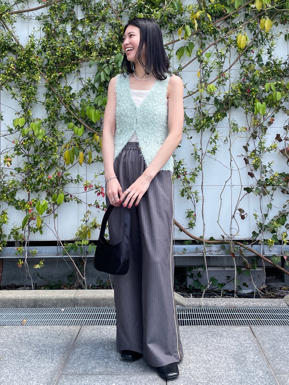 (トップス) シャギーニットですがちくちくせずに夏に快適に着ていただける素材です✨ シンプルなボトムスと合わせるだけでこなれ感がでますよ♡ 短めの丈感ですがボタンの開け閉めで見え感が変わってスタイリング楽しめちゃいます! (パンツ) 164cmフラットシューズ合わせですれすれで着用できました♡高身長さんにもおすすめです!総ゴムなのでラフに着れるのにタックパンツのきちんと感もあって合わせるトップス次第で綺麗めにもカジュアルにも着ていただけるパンツです! 裾にファスナーが付いているのでスリット作ることもできます✨ (バッグ) シンプルなので色々なシーンで使いやすいバッグ!コンパクトですがマチもしっかりありますよ✨色々なコーデに合わせやすいBLKとコーデのポイントになるPNKの2色展開です♡