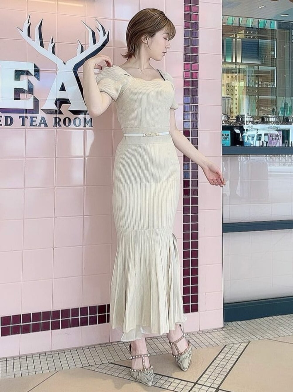 RESEXXYの大定番マーメイドワンピースの登場♡【ワンピース】今まで発売してたハートネックマーメイドワンピースやリボンチョーカーマーメイドワンピースよりシルエットがタイトになってます!なので着心地も肌に密着感はありますが、ニットなので伸び縮みするおかげでキツさは感じられませんでした♡後ろの空き具合はインナーがギリギリ見えないようになっています!裾部分のスリットから見えるシアー生地がまたポイントです♡ブラックを着用しても重たく感じないので夏にも着ていただけます!よりマーメイドを強調したい!という方はこちらがオススメですよ♡【ベルト】マーメイドワンピースにベルトは必須と言ってもいいぐらい!付けるだけで変わって見えますよ♡【シューズ】RESEXXYらしさを存分に出したかったのでスタッズパンプスを選びました♡9.5cmというヒールの高さだけを聞くと抵抗ある方が多いかも知れませんが、店頭でも試着すると歩きやすい!の声が多いです♡【アクセサリー】ベルトと統一感を出したかったのでゴールドをつけました♡今季はRESEXXYらしさのあるコーデで春を楽しみませんか?♡