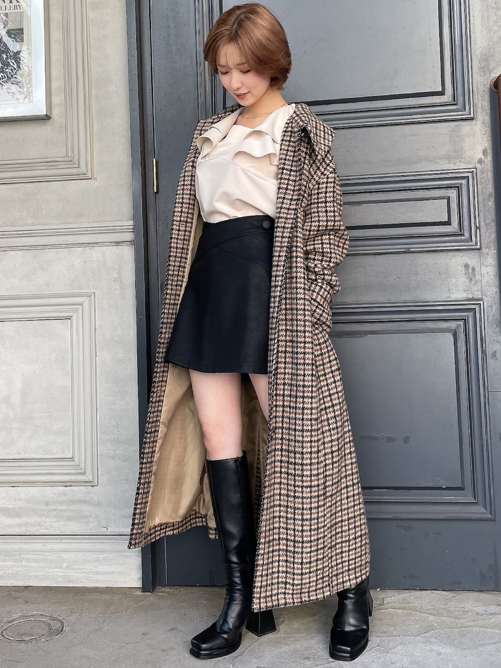 インスタリールに詳細あり♡【@moeka_rs】トレンドのステンカラーコート。カジュアルさを取り入れたキレイめコーデ♪【アウター】羽織るだけで決まる今季イチオシアイテムです♪大きめの襟で顔周りが華奢見えし、腕周りもゆったりとしているのでニットも安心して着込めます◎【ブラウス】スクエアのシルエットで鎖骨もすっきりとした印象に♪動きのあるラッフルデザインがオススメポイントです!【アクセサリー】首元が空くデザインは寂しくならないようネックレスを付けることをオススメします♪小ぶりなデザインで華奢見えも◎【ブーツ】ゴールドの金具がポイントのミドルブーツ。足周りにゆとりがあるのでスキニーパンツも安心して合わせられます!
