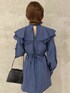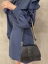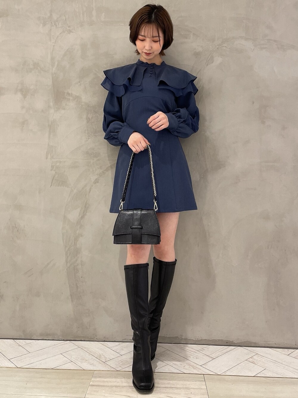 深みのあるブルーは上品に着れるカラーアイテム♪【ワンピース】流行りのラッフルデザインがおすすめポイント♡シアー生地と2枚重ねになっているのでボリュームがありますが、アウターはどれも着やすかったです◎【バック】コンパクトなサイズ感がどんなコーデにもマッチします♪スニーカー合わせでお出かけにも◎【シューズ】低身長の方から高身長の方までオシャレに履きこなせるミドル丈♡ヒールのデザインにまでこだわりが詰まった1足です♪