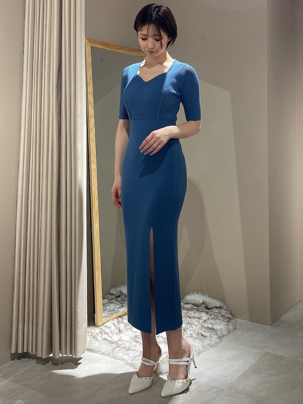 今年のトレンド♡ブルーを大胆に使ったカラーコーデ!!【ワンピース】RESEXXYらしい身体のラインに程よくフィットするタイトワンピース♡長すぎない丈感なので、低身長さんも安心して着て頂けます!ディープスリット入りなので、パンプスはもちろんスニーカーも合わせやすい1枚です◎【ミュール】RESEXXY定番のスタッズシリーズ。ミュールタイプはスタッズパンプスよりヒールが低くなる為、より日常使いがしやすいです◎普段23.5cmの私はMサイズがちょうど良く、アッパーも付いているので脱げる心配も無かったです!