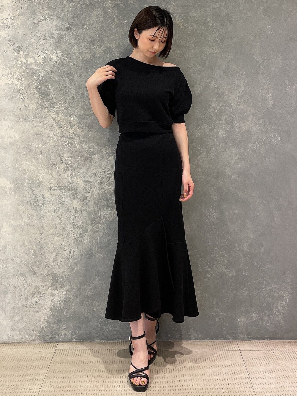 ルーズで様に見える楽ちんセットアップ♡【トップス】ワンショルダーでスウェット感を無くし、肌見せも楽しめる万能アイテム。ホワイトを着用してもインナーは透けませんでした◎【スカート】Tシャツに合わせても可愛い!ゆったりマーメイドデザイン♡スニーカーと合わせカジュアルにコーディネートするのもオススメです♪【サンダル】店頭スタッフも愛用している楽ちんサンダル!ピンヒールでも、調節可能なストラップのおかげでぐらつきを感じませんでした♪足首までストラップが付いているので、ミニ丈ボトムとの相性も◎