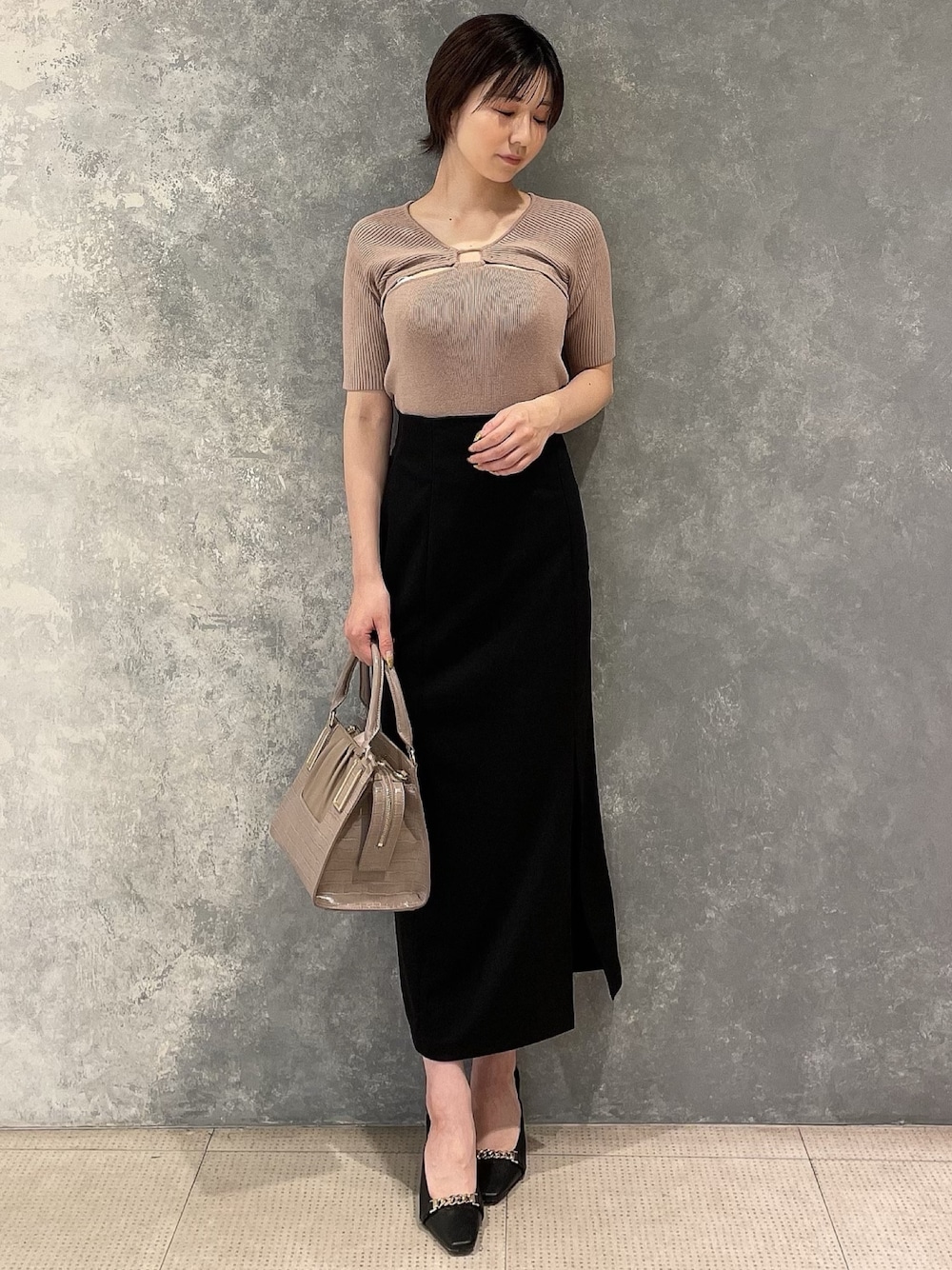大人っぽさを残したタイトスカートコーデ♡【トップス】定番人気のフロントオープンデザインがバージョンアップ♪二の腕をしっかり隠してくれる袖の長さなので、とても安心感があります◎【スカート】S.Mサイズから選べるタイトスカート。私は162cmでMサイズを着用してみました!足首近くまで丈があるので、なるべく脚を出したくない方はMサイズがオススメです◎【バック】肩がけも出来る2wayタイプです◎ペットボトルが横に入る内容量なので普段使いしやすいです!【サンダル】低めのヒールで歩きやすさがあり、どんなコーデにも合わせやすいチェーンデザイン♪スタッフ人気も高く、通勤の際やラフな日にも使いやすい1足です!普段23.5cmの私はMサイズが丁度でした◎