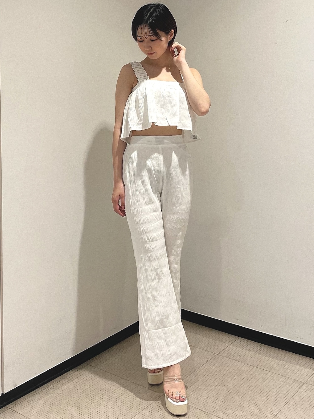 今季も登場!サラッと着れるシャーリングコーデ♡ 【トップス】162cmでへそ出しの長さになっております♪表面のフリルの中はしっかりインナーを隠してくれるようにゴムで留まるようになっています◎ 【パンツ】Tシャツと着回しても可愛い伸縮性抜群なパンツです!ウエストのゴムはかなりゆったりしております◎ 【サンダル】厚底なので疲れにくく、脚長効果が期待出来ます!全体的にヒールの高い作りになっていますが、慣れるとすぐ安定して履いて頂けます♪これからの時期、海に行く際やリゾートシーンで大活躍です◎