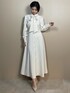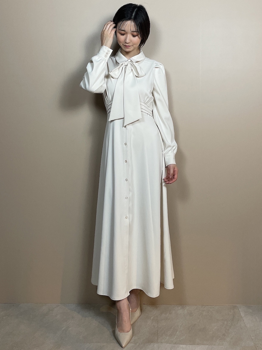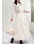 お呼ばれや素敵なシーンで着たい上品ワンピース♡ 【ワンピース】透け感を気にしないホワイトワンピース♪身体のラインを拾わず、スラットしたシルエットが完成します♡162cmで足首よりこぶし一個分ほど上でした◎ 【パンプス】デザイン性が高く、ゴールドを使用した目を惹くアイテム♡私は普段23.5cmでMサイズがちょうど良かったです!足の幅が広めな方は、ワンサイズあげてもいいかもしれません◎ストラップが付いているので、脱げないようになっております♪