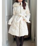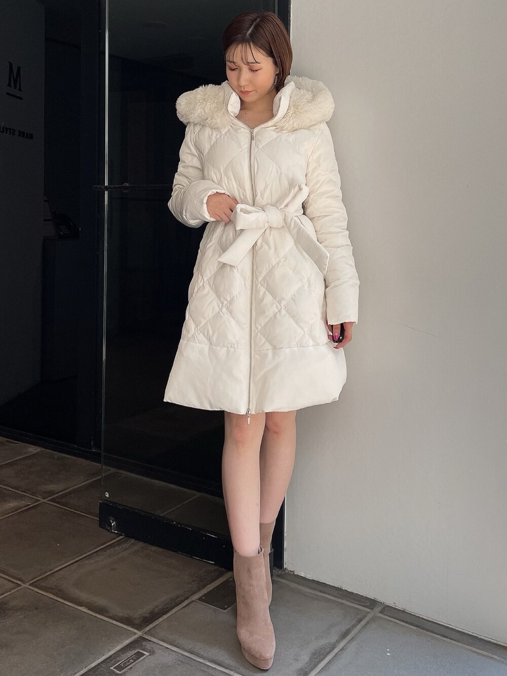 高見え抜群のロングダウン♡ 【ダウン】フード付ダウンコートより丈が少し長くなり、より大人っぽさを感じられるアウターです♪162cmで膝より少し上なので、ブーツはショートかミドル丈が相性◎です!ベルトはリボンで結んであげるのが女性らしく可愛さをプラスできます♪ 【ブーツ】私のリアルバイブーツ!スウェードはキレイめのお洋服に相性が良く、秋冬には欠かせないアイテムです◎足首部分も柔らかいので、圧迫感なくとても履きやすいです!普段23.5cmの私はMサイズが丁度良かったです♪