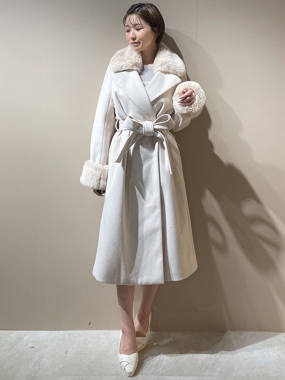 毎年大人気!1番女性らしいコートと言えばコレ♡ 【コート】寒くなってきたら必ず愛用しているファーコート♡襟元、お袖どちらもファーは取り外しが出来ます◎広がりすぎないシルエットがボディラインをカバーし、スッキリと見せてくれます♪小柄な方、低身長さんにもオススメです♡ 【ワンピース】ショート丈、ロング丈が選べるワンピース♪程よい肩あきのおかげでコーデが重たくならないようになっています◎ショート丈は162cmの私でも短すぎず、気にならない丈感でした♪ 【パンプス】ベーシックなデザインでオールシーズン履いて頂ける万能アイテム◎普段23.5cmでMサイズが丁度良かったです♪