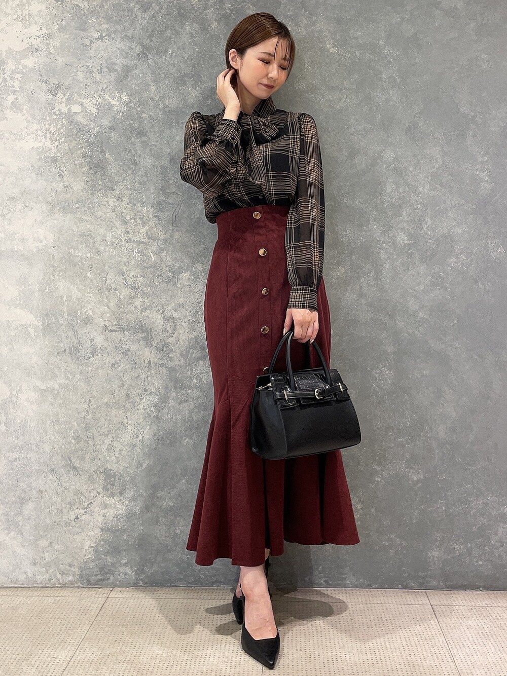 チェック×ワインレッドでシーズンムードが高まるコーデ♡お出かけにいかがですか?♪ 【ブラウス】お袖部分だけがシアーになっているブラウスです!着心地はかなり涼しさも感じられるので、9月から着用出来ます◎腕をまくって頂くと早めの時期から着ていただきやすいと思います♪ホワイトのカラーもかなり透けにくいのでオススメです♡ 【スカート】秋に入ると着たくなるワインレッド♡ゴールドのボタン使いが、とても可愛らしくポイントになります♪取り外し可能なショルダー付きです♪ホワイト、ブラックの2色がフェイクレザーです! 【パンプス】デザイン性が高く、ゴールドを使用した目を惹くアイテム♡私は普段23.5cmでMサイズがちょうど良かったです!足の幅が広めな方は、ワンサイズあげてもいいかもしれません◎ストラップが付いているので、脱げないようになっております♪ 【バック】RESEXXY毎回大人気のスクエアバック!肩がけも出来る2wayタイプです◎ペットボトルが横に入る内容量なので普段使いしやすいです!