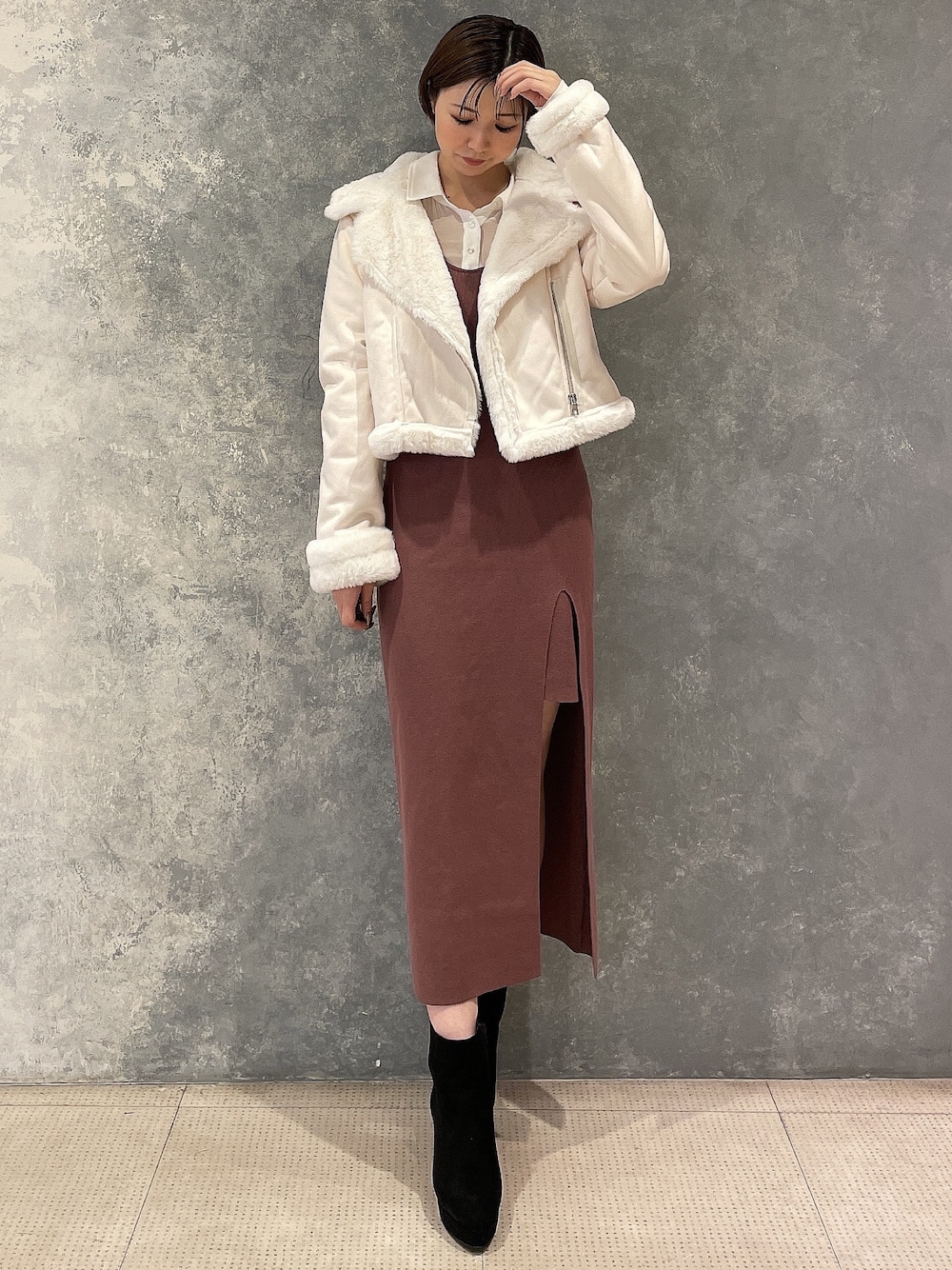 寒い冬のデートもモコモコを着て暖かく♪ 【ブルゾン】冬も過ごせる暖かさ満点なブルゾンです!裏地が一面もふもふとなっており、ブランケットを羽織ってるかのようなも触り心地がやみつきになります♡ 【ワンピース】人気のシャツドッキングシリーズ♡新色のブラウンを着てみました!ピンクっぽさのあるブラウンです◎膝上のスカート部分は生地が重なっているので、インナーのラインが響きにくいようになってます! 【ブーツ】私のリアルバイブーツ!スウェードはキレイめのお洋服に相性が良く、秋冬には欠かせないアイテムです◎足首部分も柔らかいので、圧迫感なくとても履きやすいです!普段23.5cmの私はMサイズが丁度良かったです♪