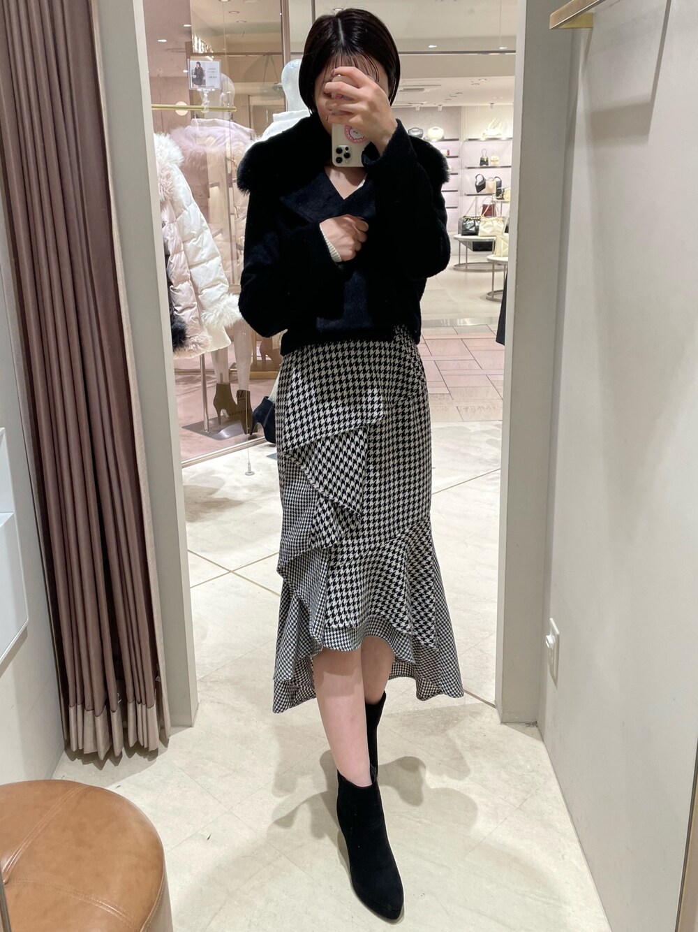 インスタリールに詳細あり♡【 @moeka_rs】 【ジャケット】ファーの取り外しが可能なアウターです!ファーはかなり大きめで、横にボリュームを感じました◎ショート丈なので、ワンピースと相性抜群です♪ 【トップス】合わせやすさ、着回しが簡単なベーシックニット♪クロスデザインは深すぎないので、胸元も安心です◎ 【スカート】私が今季買うスカートです!♡揺れ感がとっても可愛いアシメデザインは他と被らず、とてもオススメです♡マーメイドシルエットでも、骨盤のハリが気になりにくいので履いて頂きやすいです◎ 【ブーツ】私のリアルバイブーツ!スウェードはキレイめのお洋服に相性が良く、秋冬には欠かせないアイテムです◎足首部分も柔らかいので、圧迫感なくとても履きやすいです!普段23.5cmの私はMサイズが丁度良かったです♪