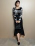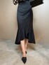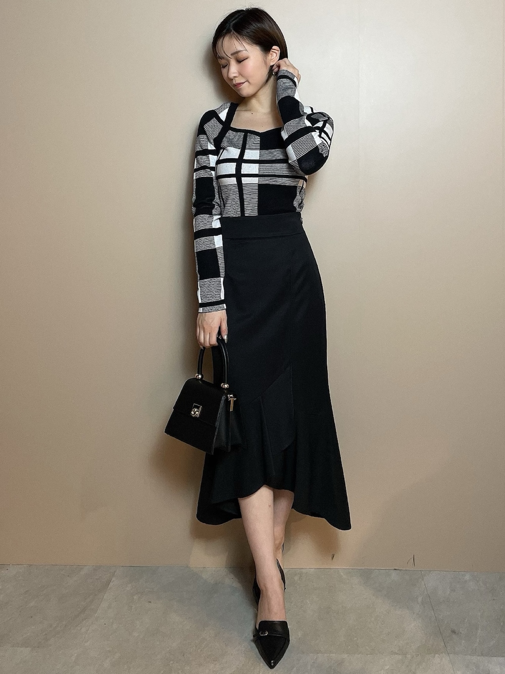重たさを気にせず着れるブラックコーデ♪ 【トップス】半袖バージョンで大人気を頂いたデザインが復活です♡ピタッとしたシルエットですが、ラインが響きにくくとても着やすいです◎ 【スカート】フリルデザインが他とは違うマーメイドスカートです♡アシンメトリーデザインは脚が細く見えるのと、歩きやすいのがメリットです◎ 【バック】シンプルなゴールドデザインが高見えしてくれます♡中身はコンパクトなので、折りたたみの小さな財布がオススメです◎ 【ミュール】低めなヒールで、ラフに履いて頂きやすいです♪パンツスタイル、スカートコーデどれも合わせやすいです◎