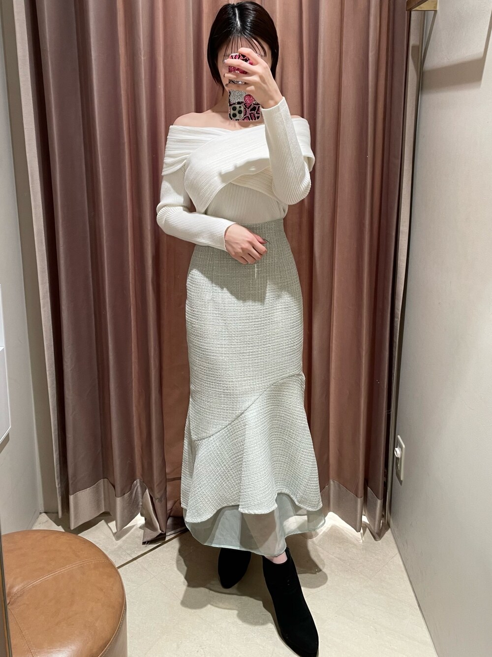 ミントが映えるカラーコーデ♪デートにぴったりなニットとマーメイドの組み合わせです♡ 【トップス】デコルテをスッキリ見せられるキレイめニット♪鎖骨が綺麗に見えるなと感じました◎しっかりとした生地で、今の時期に万能にお使い頂けます! 【スカート】王道キレイめコーデが完成します♡ブラウスを合わせればお呼ばれ風、ニットを合わせば普段使いしやすいコーデが完成します♪ 【ブーツ】私のリアルバイブーツ!スウェードはキレイめのお洋服に相性が良く、秋冬には欠かせないアイテムです◎足首部分も柔らかいので、圧迫感なくとても履きやすいです!普段23.5cmの私はMサイズが丁度良かったです♪