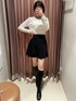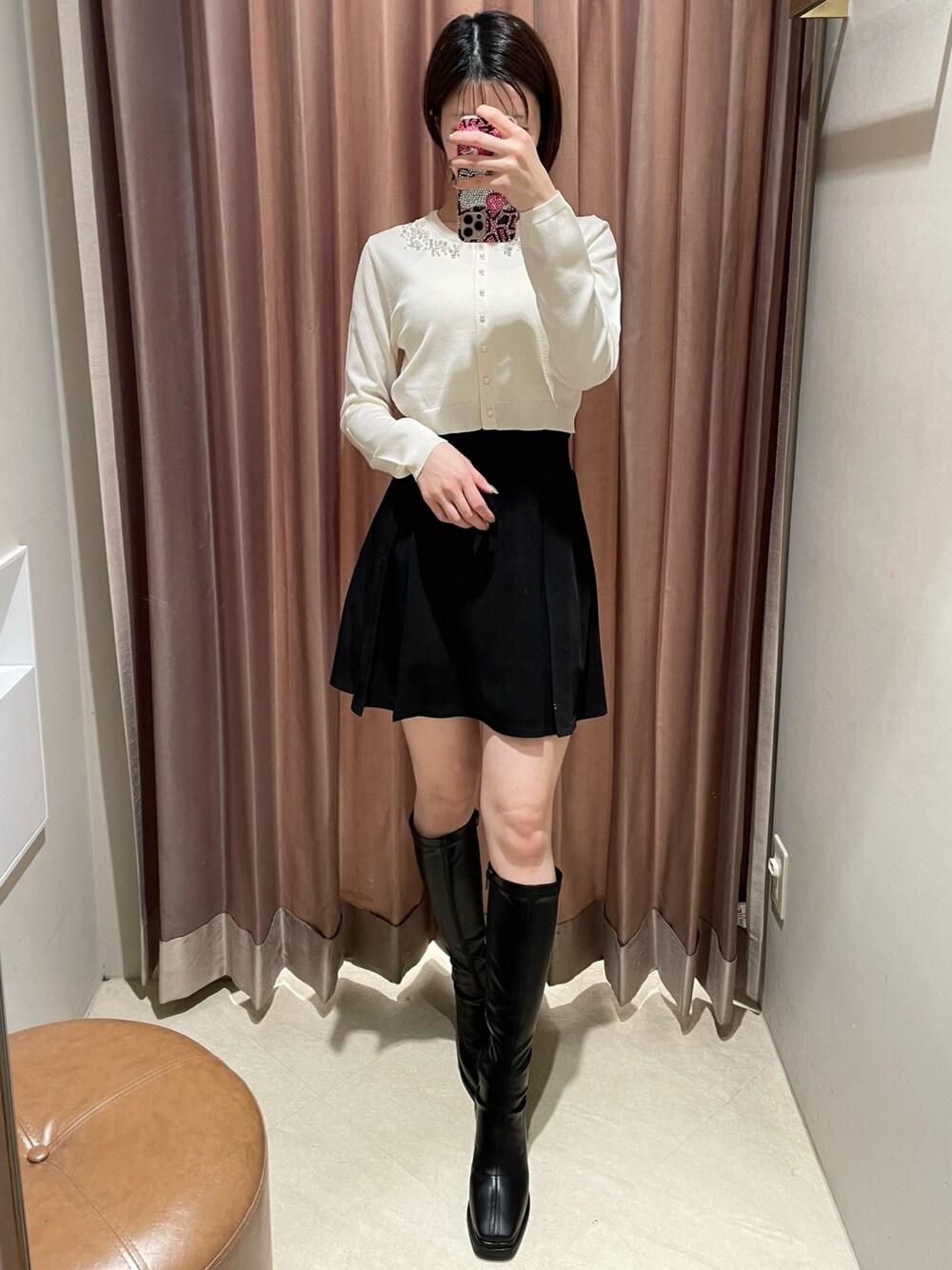 上品なニットをミニ丈と合わせて可愛らしいコーディネートに仕上げました♡ 【トップス】キャミソールとセットのアイテムです!カーディガンのみ羽織として着回すのも◎細かなパールで、ネックレスが無くても首周り華やかな印象に♪ 【スカート】ベーシックで着回しのしやすい、フレアデザインです♪ニット系をインして着て頂くと、ウエスト周りスッキリ見えます! 【ブーツ】歩きやすさ抜群なピンヒールブーツ!安定感があるので、ぐらつきがなくピンヒール初心者さんでも履いて頂けます◎23.5cmの私はMサイズが丁度良かったです!