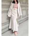 マーメイドスカート合わせで大人めなジャケットセットアップ♡ 【ジャケット】ヒップが隠れる長さのジャケットです!ワンカラーのワンピースと一緒に合わせても可愛いですよ♪袖が長く感じる方は、ロールアップしてあげるのがオススメです! 【トップス】肩部分の内側にボタンがついており、オープンショルダーになる2wayのアイテムです!薄めのリブニット生地なので、夏も着用できます◎ 【スカート】インナーのラインが響かない優秀なマーメイドスカートです♡シンプルで使いやすいデザインなので、お仕事にも向いてます♪ 【バック】コンパクトな見た目ですが、500mlのペットボトルが入る自慢の内容量になっています◎ 【ヒール】T字のデザインのおかげで、サンダルでも脱げにくく安定感がありました!普段23.5cmでMサイズが幅もピッタリでした◎