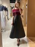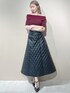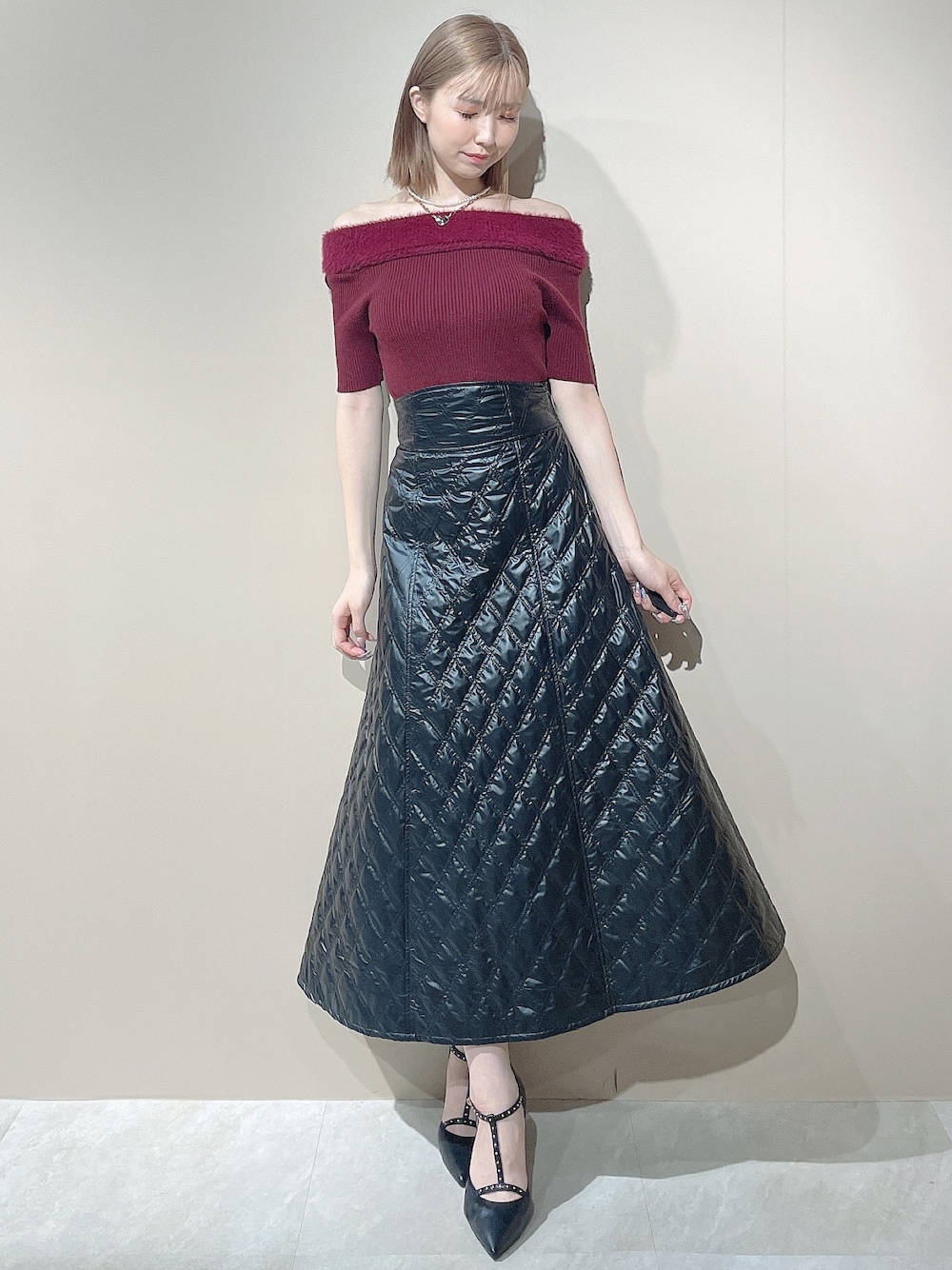 シャギーやキルティングで秋らしさのあるコーディネートです♡ 【トップス】シャギーが目立つオフショルニットです♡伸縮性バッチリなので、肩周りにキツさも無く、オフショルとして着やすいです◎5分袖なので気になる二の腕もカバーしてくれます! 【スカート】キルティングにメタリック素材が入っているので、少し硬めなハリのある生地感になっております◎型崩れせず綺麗なAラインを保てるので高見えします♪ 【ヒール】スタッズのようなデザインで、私が一目惚れしたアイテムです♡ピンヒールですが、クッションが強くとても柔らかいので履きやすかったです◎23.5cmの私はMサイズがピッタリでした! 【ネックレス】パールとチェーンの可愛いコンビネーションです♡ハートデザインが女の子らしさもあり、身に付けるだけで気分が上がります♪