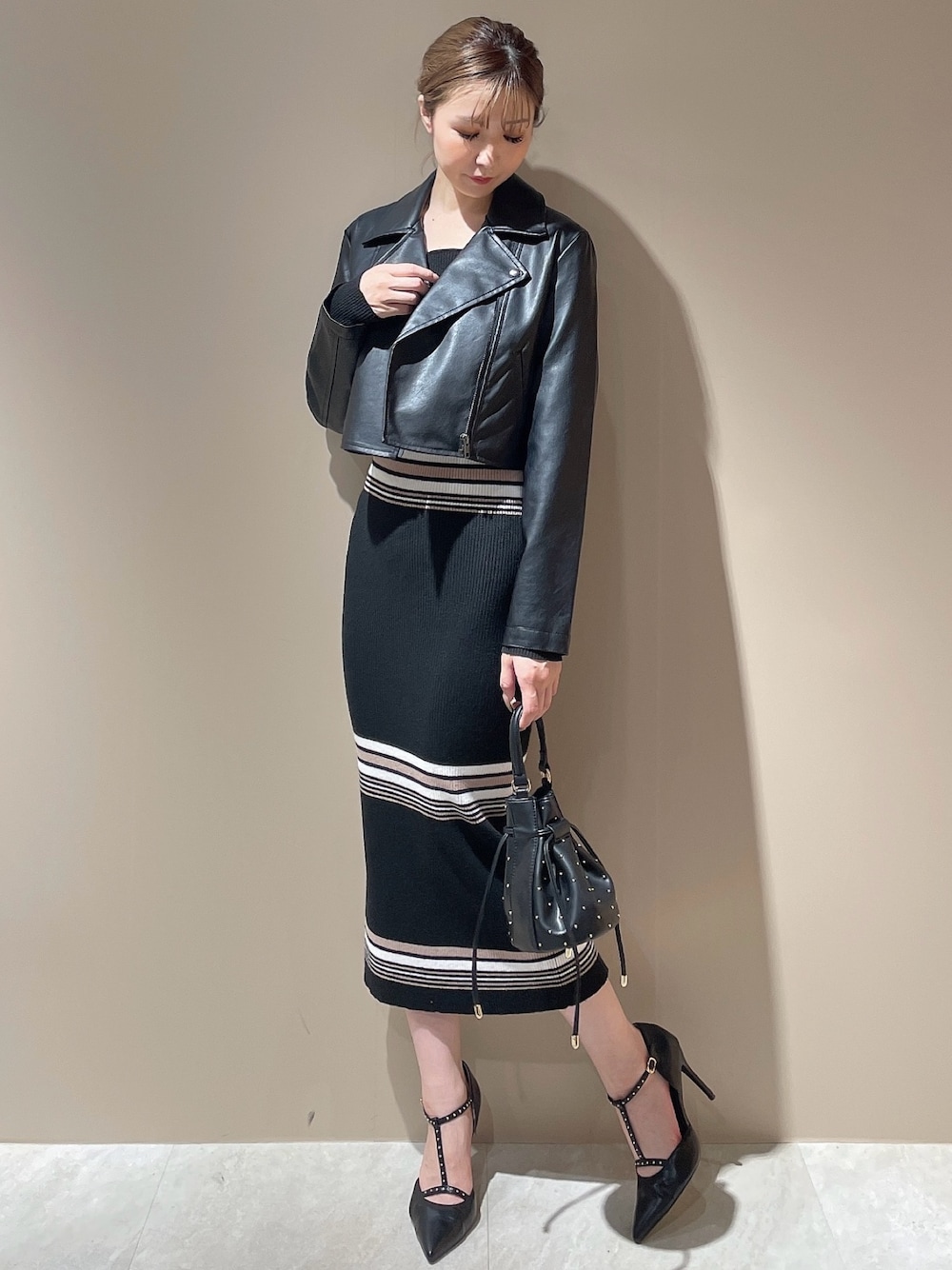 RESEXXYらしいタイトワンピが主役のキレイめコーデ。 【ライダース】RESEXXY定番のシンプルなデザインが人気のライダースです!S、Mサイズで丈感がかなり変わってきます◎キレイめワンピやスカートと合わせたい方はコンパクトに華奢みえするSサイズがおすすめです♪ 【ワンピース】S、Mサイズで丈感がお選びいただけるアイテムです!ロング丈はスリットが入っています◎162cmでふくらはぎ真ん中ぐらいの丈感なので、低身長さんにもオススメです♪ 【ブーツ】くしゅくしゅっとしたデザインが可愛いブーツ♡とっても柔らかく脚への負担が少ないブーツです!普段23.5cmの私はMサイズがぴったりでした◎ 【バック】散りばめられたストーンが可愛いミニバックです♪折りたたみのお財布や、小物類の収納はバッチリの内容量です!クシュッと縛ってお使い頂けます◎
