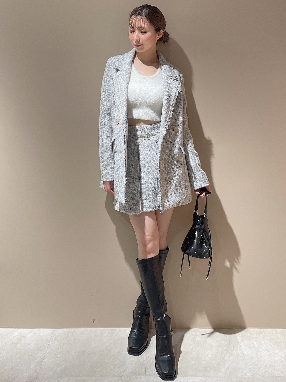 秋冬の定番!ツイードセットアップ♡ 【ジャケット】とっても高見えしてくれるミディアムジャケットです♡ロングワンピースと合わせて上品な印象にしても♪162センチでセットアップ着用のできるミニスカートと合わせると、丈感が似ていて、少しスカートが見えるぐらいです◎ 【トップス】毎年RESEXXYでは大人気を頂いているシャギーアイテムです♪少しショート丈でインせず着るのがちょうど良かったです◎ふわふわの生地が触り心地良く、チクチクしたりかゆくなるような素材では無いのでとても着やすいです◎ 【スカート】インナーにパンツが付いているので、高身長の方も安心です♪ツイードの柄が映えるのでトップスはシンプルなデザインがオススメです♡ 【バック】散りばめられたストーンが可愛いミニバックです♪折りたたみのお財布や、小物類の収納はバッチリの内容量です!クシュッと縛ってお使い頂けます◎ 【ブーツ】ふくらはぎに圧迫感がなく、カジュアルな雰囲気にも合わせていただけるブーツです♪普段23.5cmの私はLサイズが履きやすかったです!